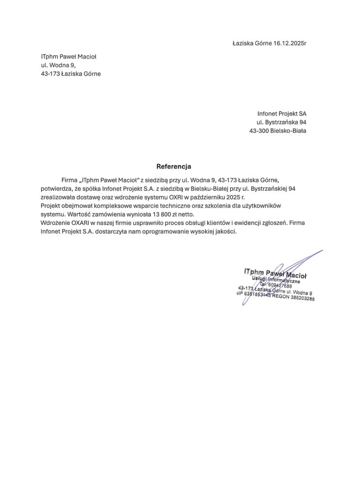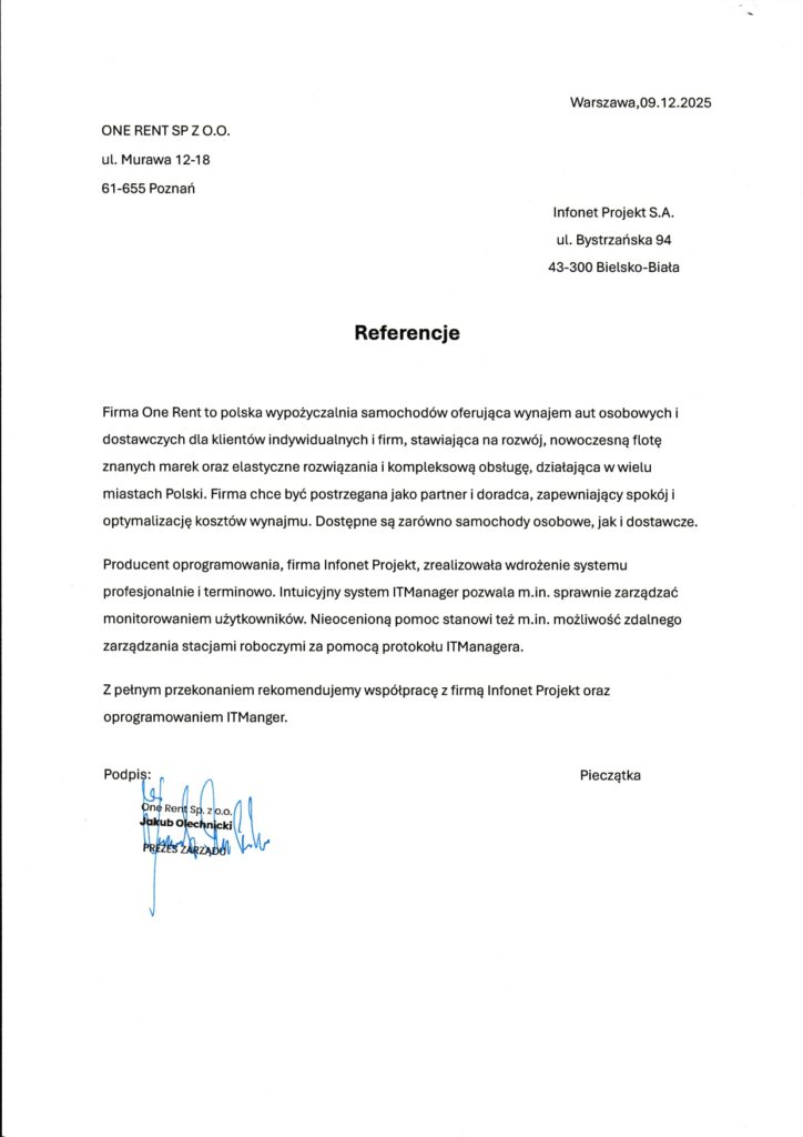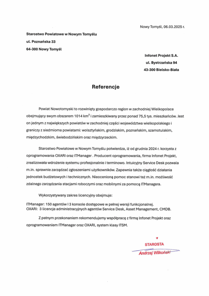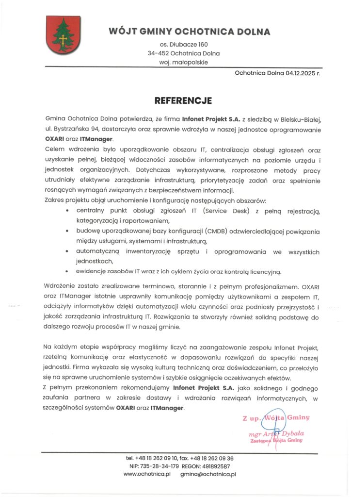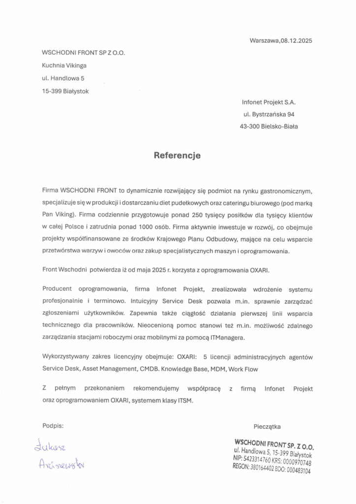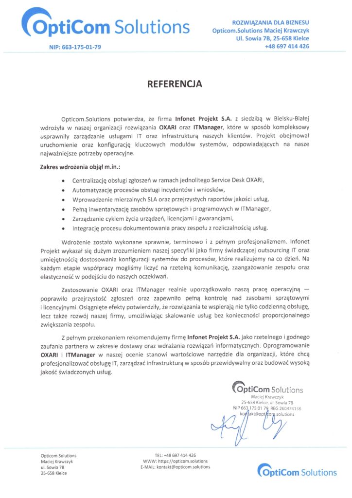 „W celu usprawnienia wymiany informacji i ujednolicenia używanych systemów, wdrożyliśmy system ITManager. Narzędzie profesjonalnie wspiera pracę zespołu IT, w szczególności w zakresie zarządzania zasobami i procesami, za które odpowiadamy. W 2021 r. system został uzupełniony o OXARI ITSM – zintegrowaną z ITManager platformę WWW, której centrum stanowi rozbudowany ServiceDesk.”