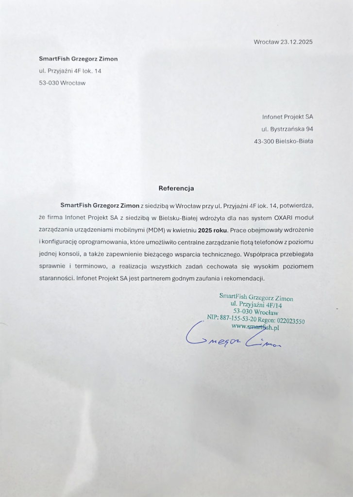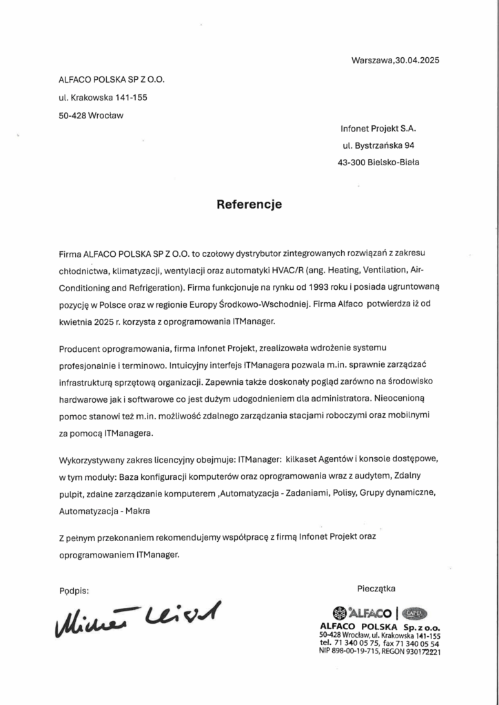 „Korzystamy z wiedzy i doświadczenia Infonet Projekt przy wyborze technologii Enterprise dla naszego środowiska. Używamy także oprogramowania Infonetu – systemów ITManager oraz OXARI, które wspierają nasz zespół IT w codziennym zarządzaniu stacjami roboczymi i ServiceDeskiem.”